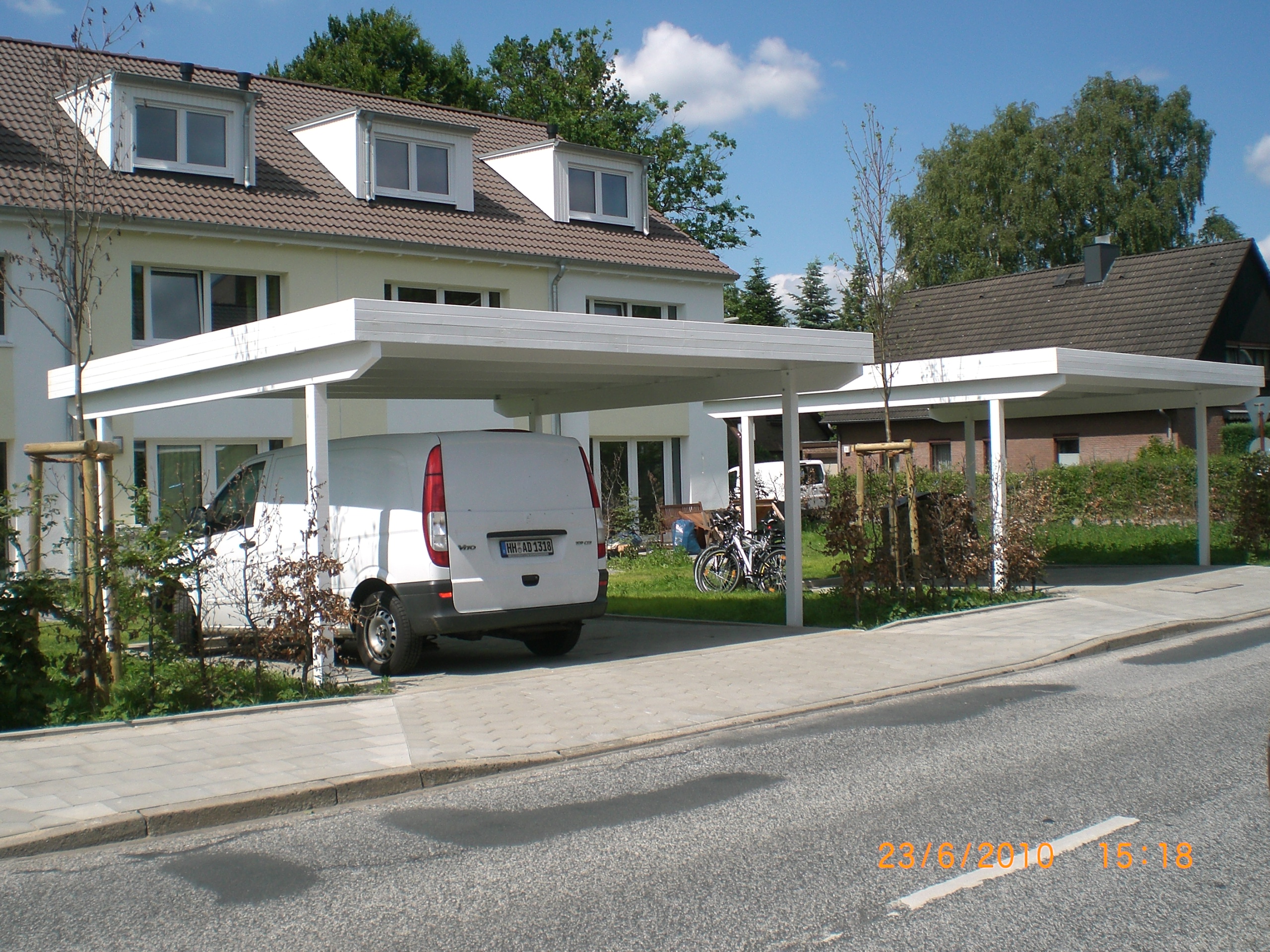 Quasi alle unsere Doppelcarports sind freitragend. Das heißt, daß Sie keine Mittelpfosten haben. Vorteil: Sie erhalten deutlich mehr Platz zum parken und öffnen der Türen.
