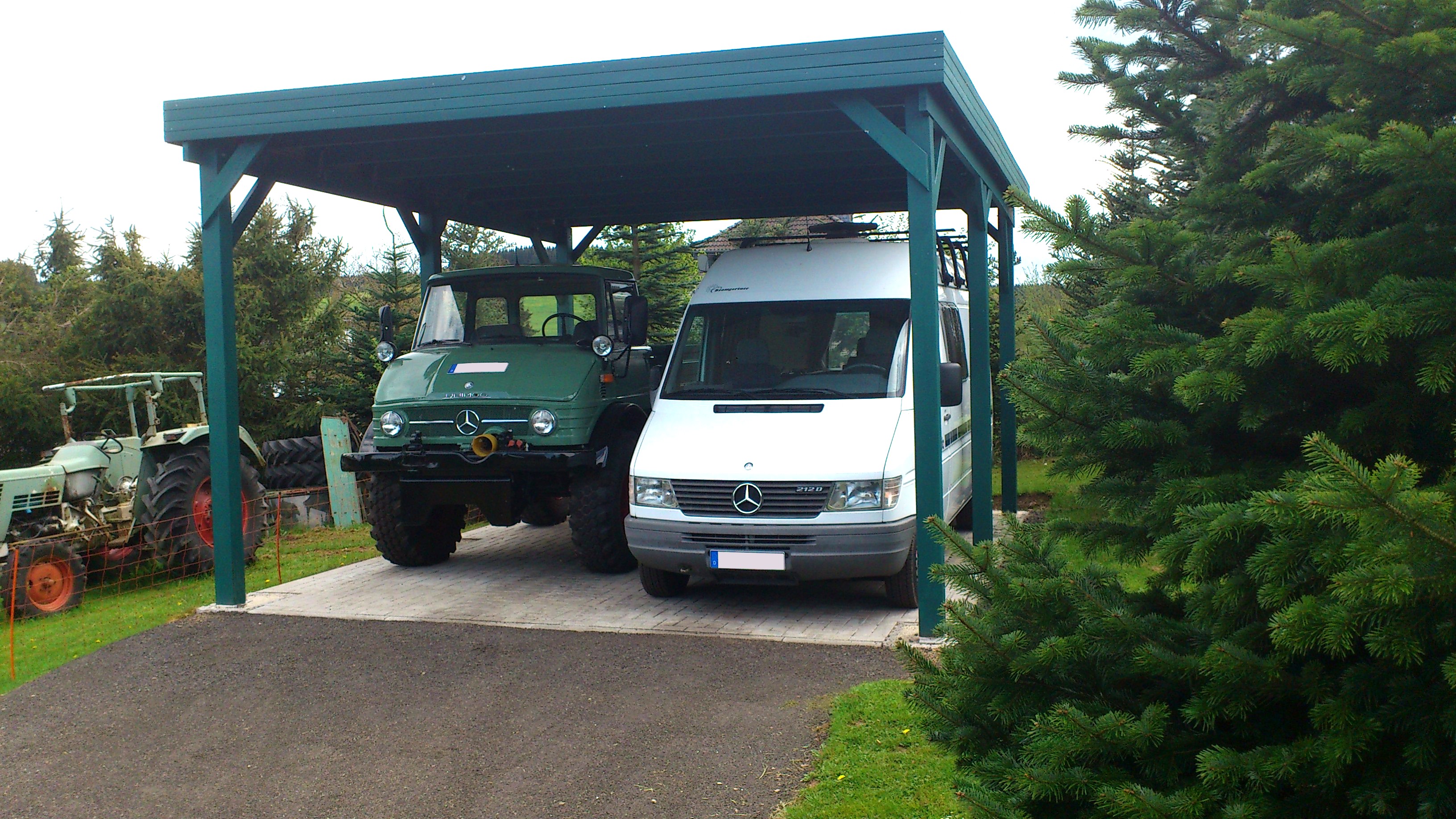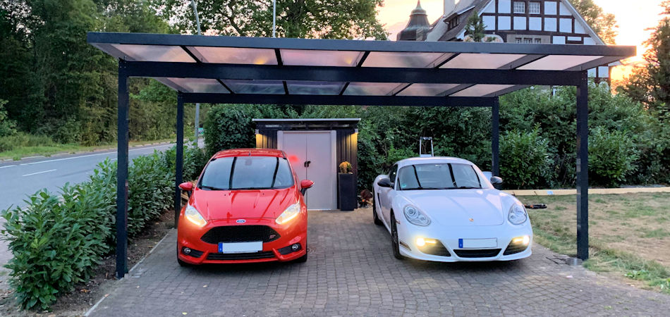 Der freitragende Carport für zwei Autos hintereinander.