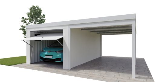 Unsere DUROBOX-Garagen können Sie auch als Garage mit angeschlossenem Carportals offenen Stellplatz erhalten.