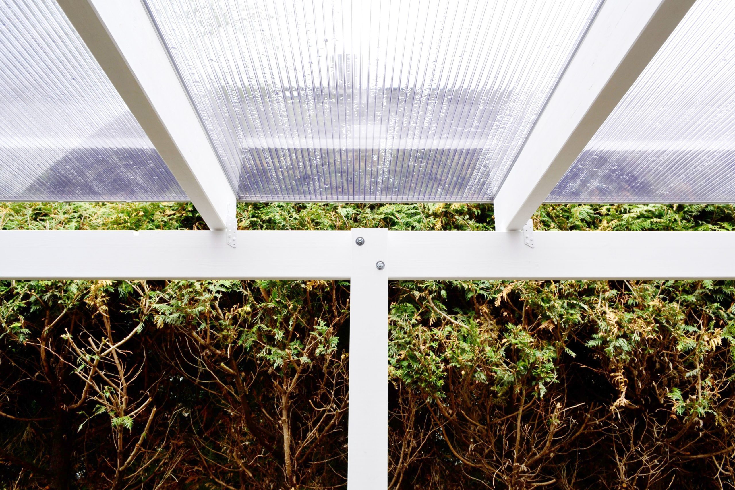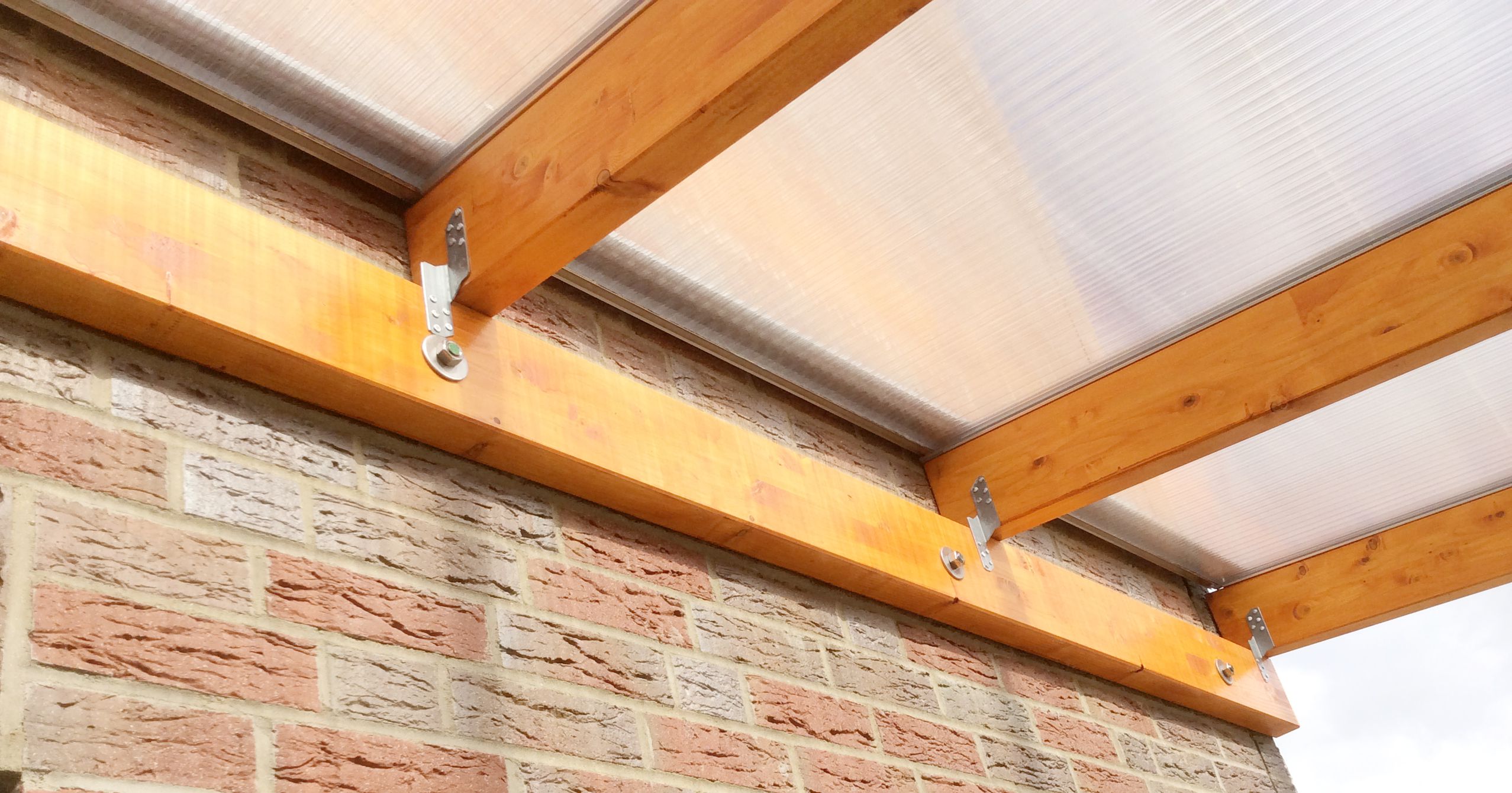Polycarbonat-Stegplatten sind zu 100% hagelbeständig und in vielen verschiedenen Ausführungen erhältlich. Sie werden mit einem Alu-Klemmsystem bei Terrassendächern aus Leimholz eingesetzt.