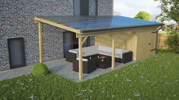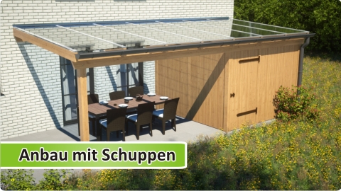 Anbaukonstruktion mit integriertem Abstellraum für Grill, Rasenmäher und Gartenmöbel.